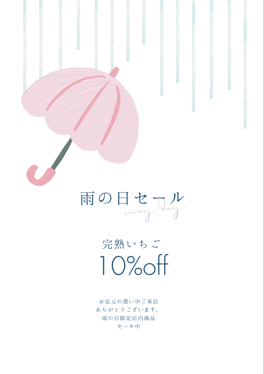 2026年03月31日本日3月31日雨の日セール開催!! 本日は一日中雨予報ですね。雨に日セール開催します!!完熟いちごは10%オフ完熟加工用いちご1キロ1300円です。雨の日は家でコトコトジャム作りいかかですか~??よろしくどうぞ~